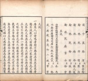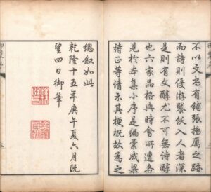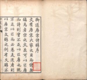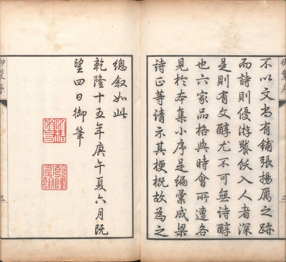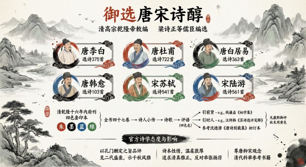 《唐宋诗醇》是清代乾隆年间出现的一部大型唐宋诗歌选集,它虽然题署为乾隆帝 “御选”,但事实上正如乾隆在序言中所坦承的:“兹《诗醇》之选,则以二代风华,此六家为最。时于几暇,偶一涉猎。而去取评品,皆出于梁诗正等数儒臣之手。” 其中收李白诗 375 首,杜甫诗 722 首,白居易诗 363 首,韩愈诗 103 首,苏轼诗 541 首,陆游诗 561 首。宋诗中只选了苏轼、陆游两家,充分表现出尊唐抑宋 [1] 的观念。