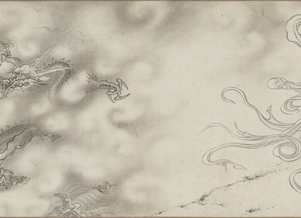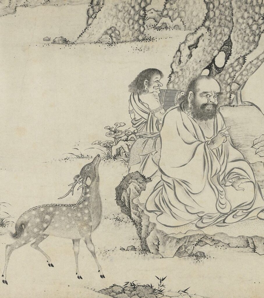 虽然画名中带有 “百佛”,画卷并未描绘一百尊佛陀列坐的场景,而是将视线聚焦于十六罗汉、天王、狮、佛道侍者、供养人、佛、鬼怪等宗教形象,以及寒林枯树、松、竹、莲荷、灵芝、猿、鹿、虎、龙等自然物象,还有香炉、宗教器用等器物。这种将神圣的佛教人物置于世俗化、自然化的山林野趣中的处理方式,褪去了宗教的威严感,极具东方文人画的禅意特质。