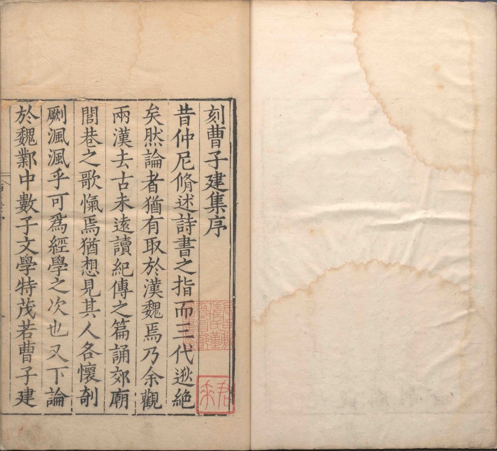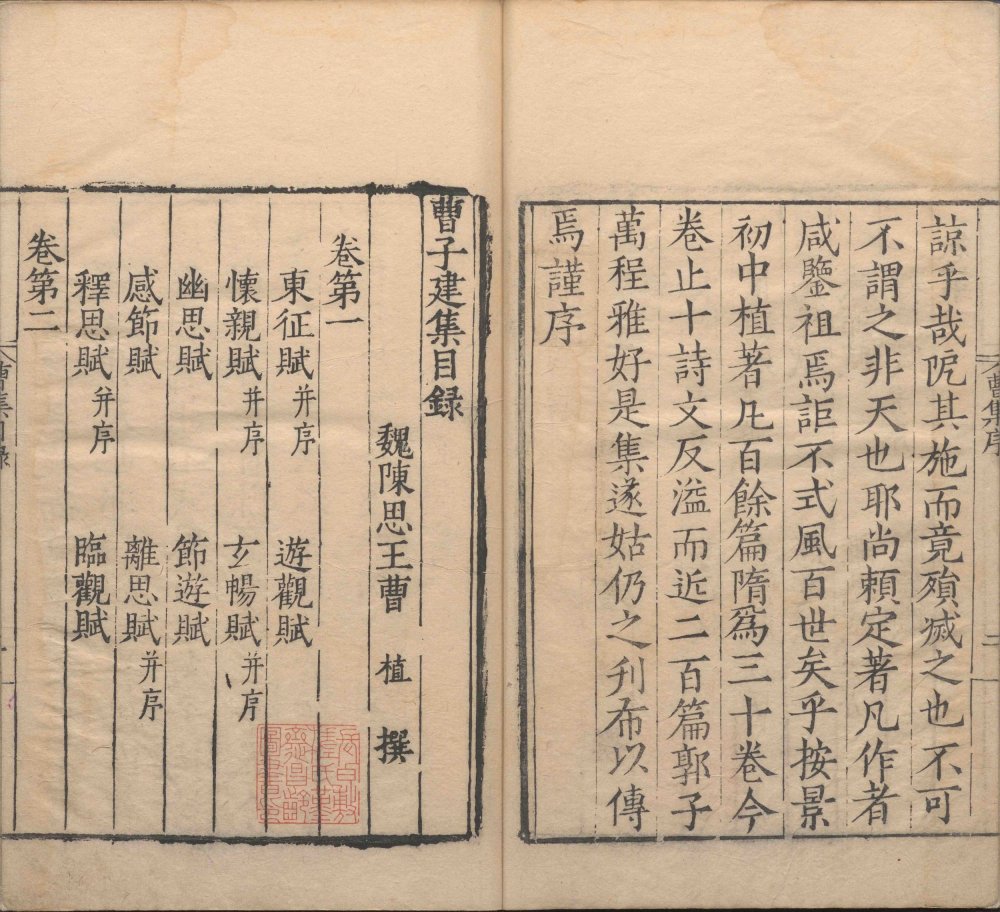 《魏志》本传记曹植身后曹睿下诏集录前后所著赋、颂、诗、铭、杂论凡百馀篇。《隋书·经籍志》除著录 “魏陈思王曹植集三十卷” 外,复有《列女传颂》一卷,《画赞》五卷,均佚。后人搜辑遗文,重为编定。今存《曹子建集》十卷,卷一至卷四为赋,卷五为诗,卷六为乐府,卷七为颂、赞、铭,卷八为章、表、令,卷九为文、咏、序、书、诔、哀辞,卷十为论、说。此郭云鹏宝善堂刊本《曹子建集》,是明代中期较有代表性的古籍刻本之一。