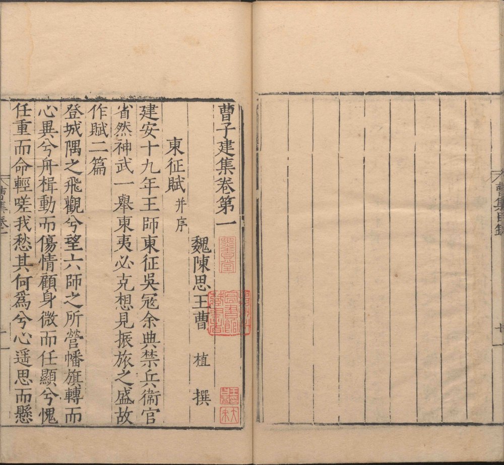 《曹子建集》由三国(魏)时期曹植(字子建)撰。全书共十卷,收录曹植赋作四十余篇(代表作有:洛神赋、鹞雀赋等)、诗七十余篇(其中以五言诗歌成就最为突出,代表作有:七步诗、七哀诗、白马篇等)、杂文九十余篇。后附曹集疑字音释。此为明嘉靖二十一年郭云鹏宝善堂刊本。
