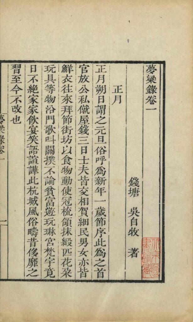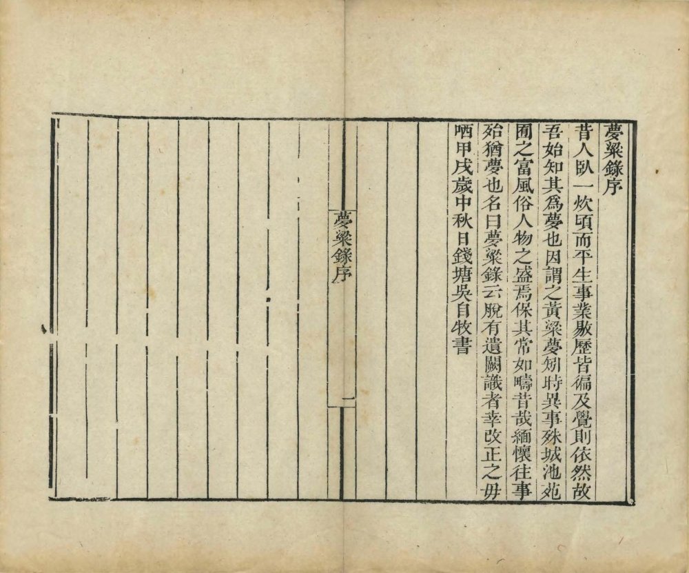 《梦粱录》书名取自 “黄粱一梦” 的典故,蕴含着深刻的亡国之痛与人生如寄的感叹。关于此书的成书年代,据自序有 “时异事殊”,“缅怀往事,殆犹梦也” 之语,应在元军攻陷临安之后。所署 “甲戌岁中秋日”,甲戌即宋度宗咸淳十年(1274),疑传抄有误。