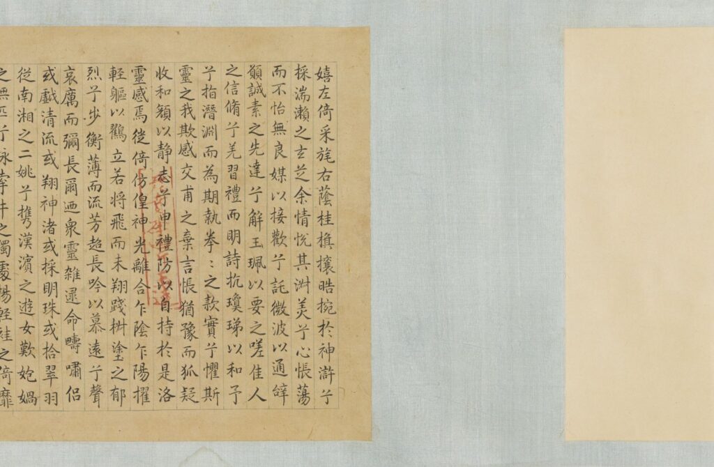 《洛神赋图》卷是晋代顾恺之根据三国时期曹植《洛神赋》创作的故事画。此《摹顾恺之洛神图》卷由清代丁观鹏奉敕临摹。其构图与人物神怪造型忠于原卷,以青绿山水设色,泥金勾勒,并融入西洋光影与透视技法,重现了人神相恋的连环叙事。此卷现藏于台北故宫博物院。