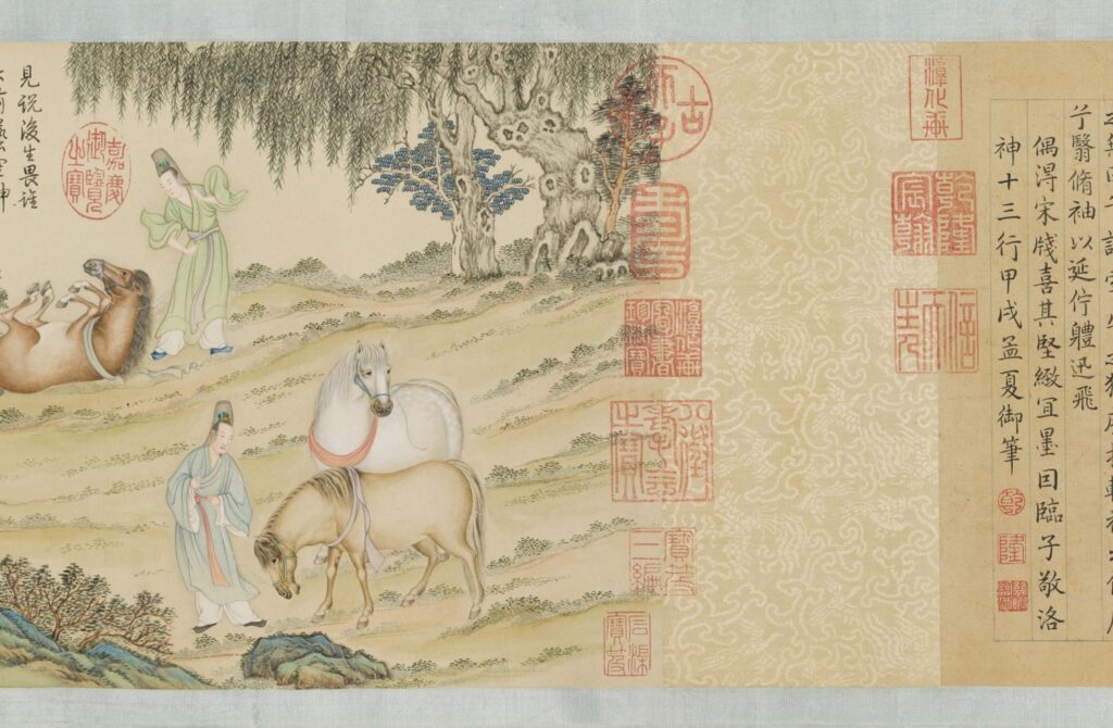 作者款识:乾隆十九年四月 臣丁觀鵬奉勑 恭摹顧愷之筆意