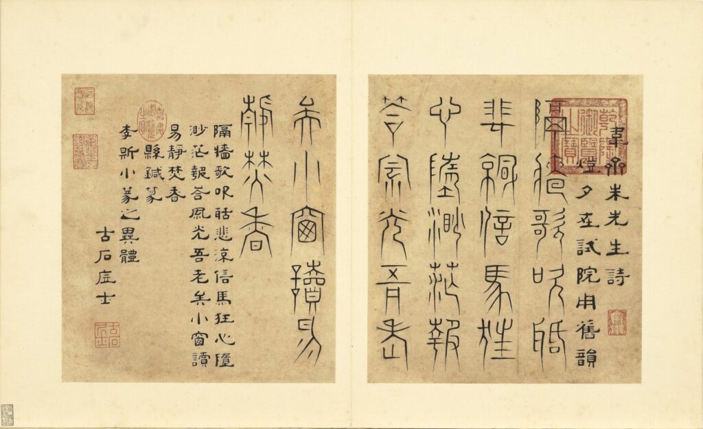 韋齋朱先生詩。畫雪梅。(隸書)。詩人未見雪梅畫。只識前村橫水枝。百巧摸香摹不出。此詩風味略相宜。(篆書)。詩人未識雪梅畫。只見前邨橫水枝。百巧摸香摹不出。此詩風味略相宜。龍爪書。自飛龍朱襄氏作龍之後。復有是體。或云王右軍作。古石居士。(隸書)